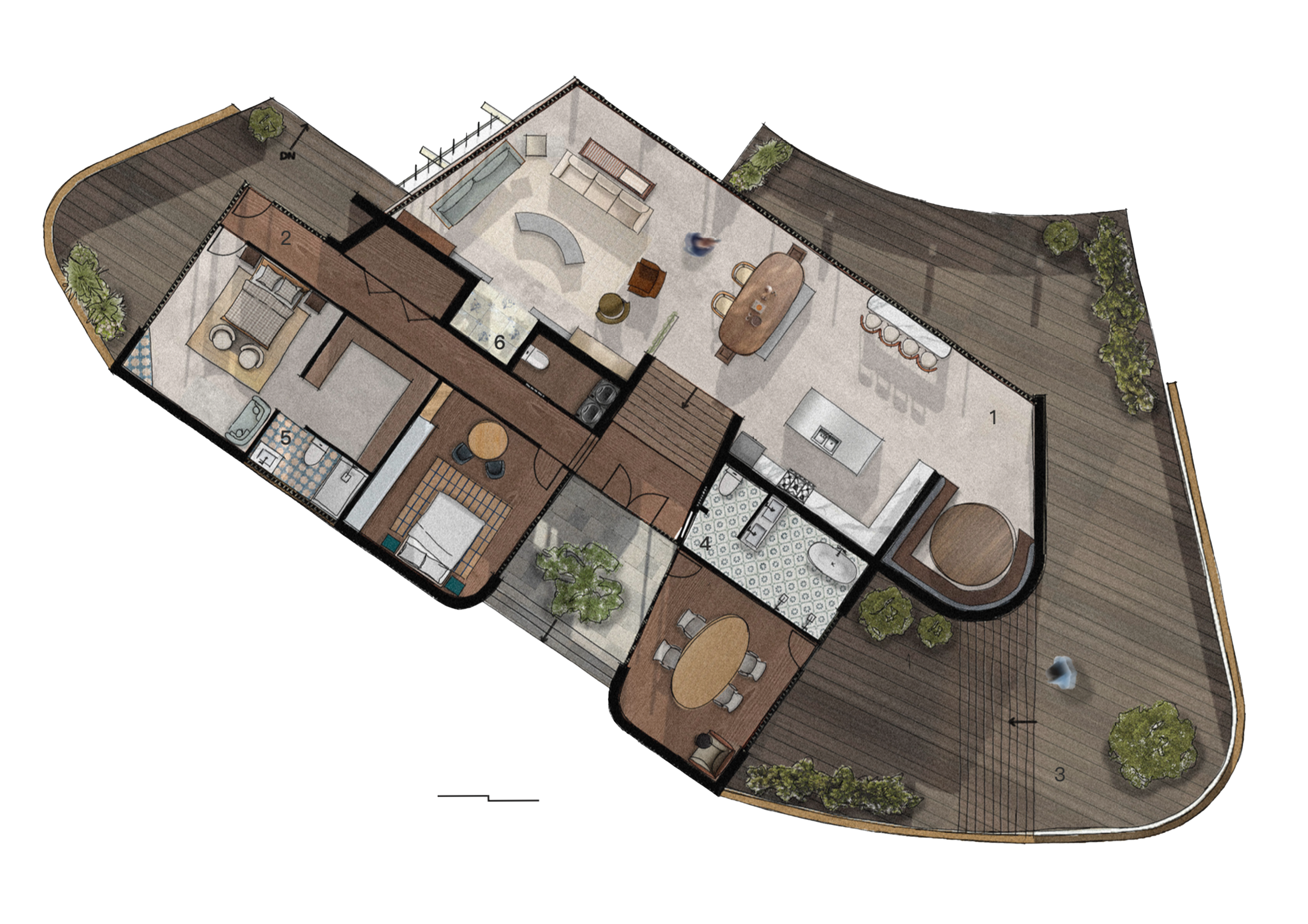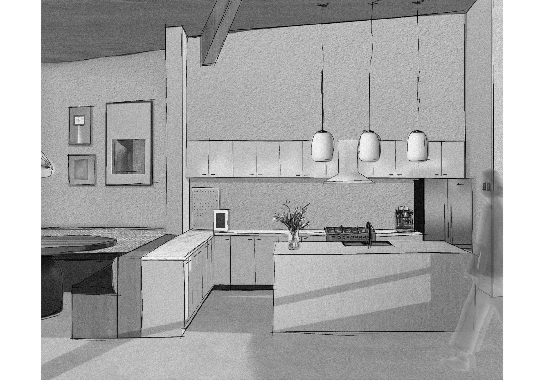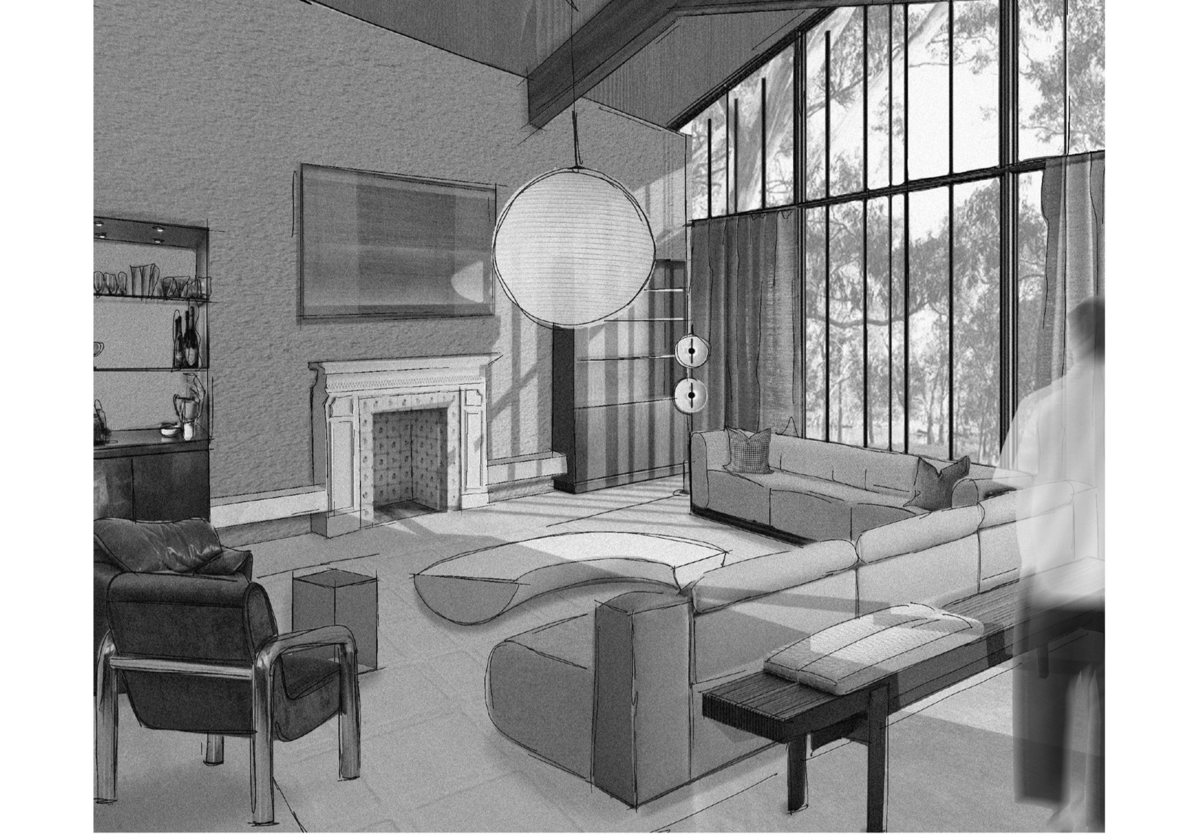 Using Revit, Photoshop, InDesign, and Procreate, to achieve this sectional render, showcasing the intricate details of the fireplace mantel and the porcelain tiles. Each aspect of the living room is thoughtfully choosen to foster a cohesive design. The use of materiality, enhances the depth and character of the space, balancing beautifully with the timber ceiling beams and expansive windows that frame the stunning views of Red Hill, Mornington, VIC.